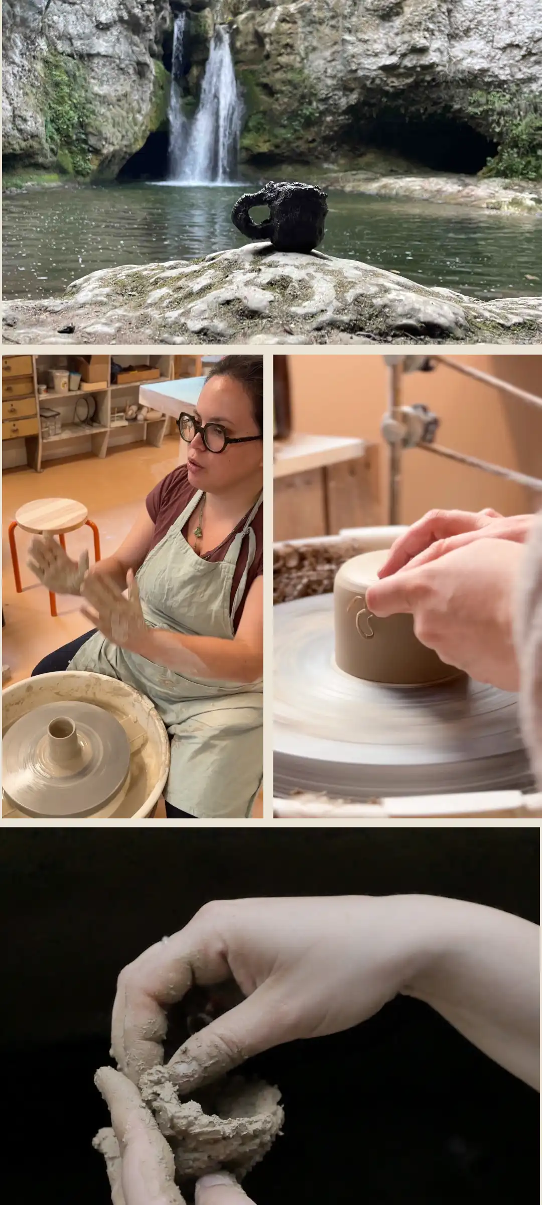 En 2022 j’ancre mes racines dans la plus petite commune du canton de Vaud, Mauraz. Je trouve un bel atelier, entouré de nature et d’animaux, où j’ai décidé d’enseigner la poterie en alliant connaissances techniques et exploration de soi. Ainsi je crée un pont entre mes deux parcours la poterie et la danse : mouvement libre et gestuelle technique ancestrale.